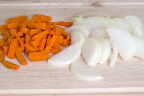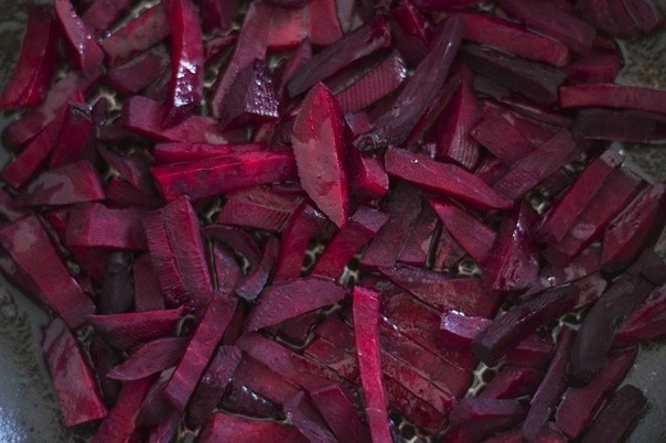 2. Свеклу почистить, нарезать брусочками, выложить на сковороду и тушить минут 10. Морковь нарезать брусочками, лук — полукольцами, добавить к свекле, тушить ещё 5 минут.