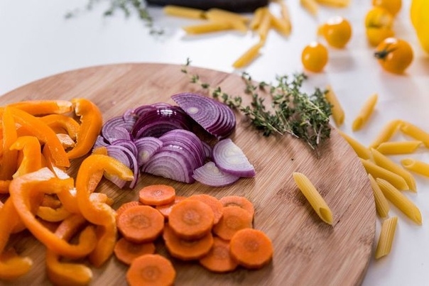 1. Отварите пасту. Нарежьте сосиски. Нарежьте овощи.