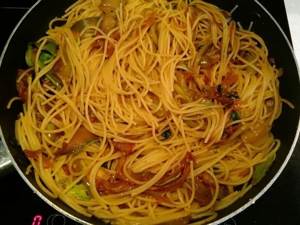 3. Отварить спагетти по инструкции на упаковке и обжарить пару минут с овощами.