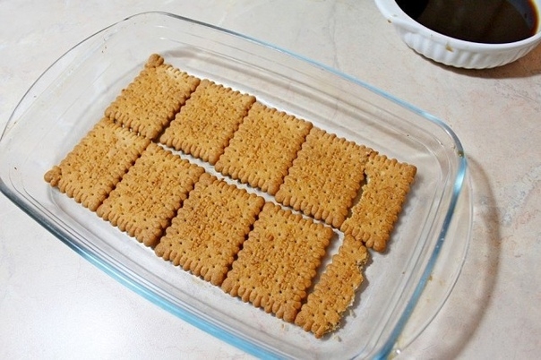 5. Тем временем заварить кофе (нужно 150-200 мл готового кофе), остудить его и подготовить печенье. Печенье лучше купить сухое (типа несоленого крекера).