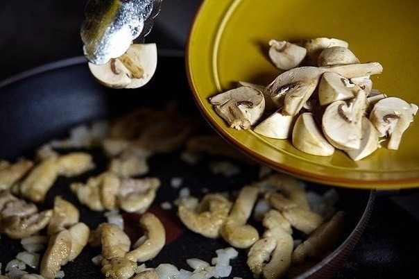 3. В сковороде на растительном масле обжарить запанированное куриное филе со всех сторон до полуготовности. Затем добавить шампиньоны, репчатый лук. Все вместе жарить до готовности мяса.