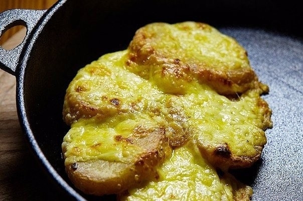 8. Обжаренный картофель переложить на чугунную сковородку, посыпать натертым на крупной терке сыром и отправить в разогретую духовку.
