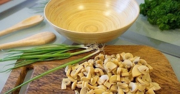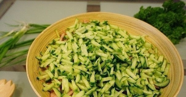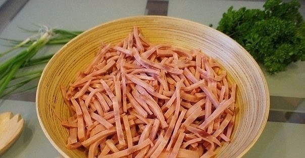 1. Нарежьте маринованные грибы, а также ветчину и огурцы соломкой. Перья лука измельчите.