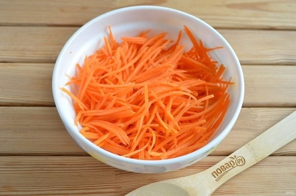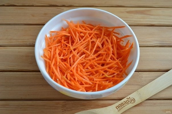 2. Натираем морковь длинной соломкой с помощью специальной терки. Если таковой нет, можно постараться нарезать.