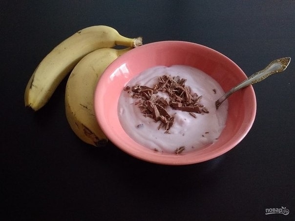 1. Сначала сделайте заправку. Йогурт перемешайте с мелкими кусочками шоколада (или сразу натрите шоколад).