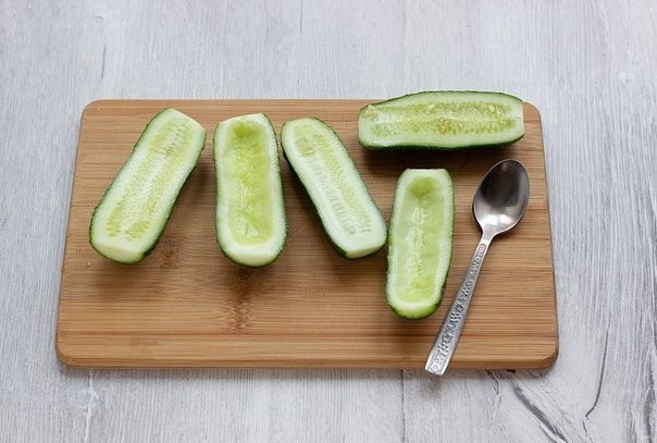 5. Огурцы помойте, обсушите, немного отрежьте кончики и вдоль разрежьте пополам. Сердцевину с семенами удалите чайной ложкой.