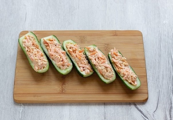 6. Выложите начинку в лодочки из огурцов и украсьте зеленью петрушки.