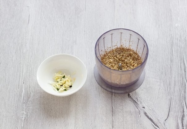 3. Орехи измельчите блендером. Чеснок очистите и пропустите через пресс или натрите на мелкой терке.