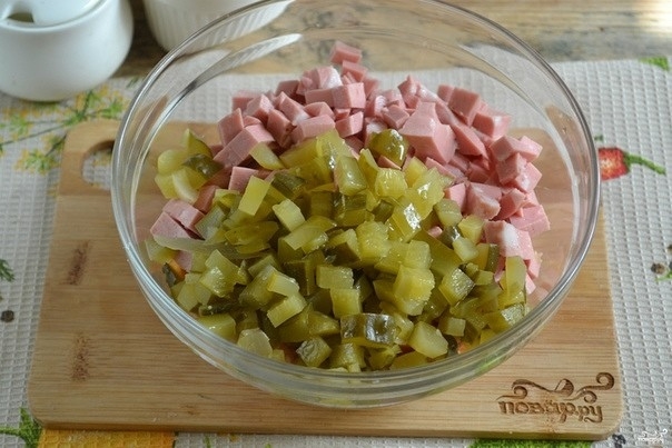 Кубиками примерно такого же размера нарежьте консервированные огурцы. Перед тем как добавить их в общую тарелку, рукой слегка отожмите сок, чтобы салат не тек. Колбасу также порежьте кубиком и добавьте к остальным ингредиентам.