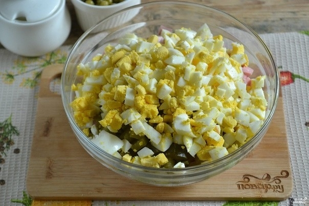 Варёные яйца порежьте или тоже измельчите при помощи винегретницы.