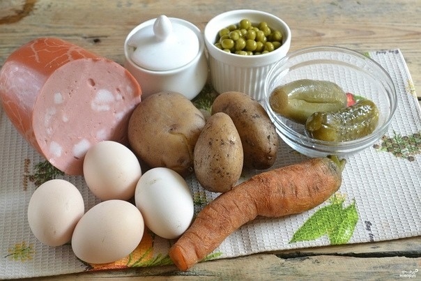 Подготовьте все необходимые ингредиенты. Сварите вкрутую яйца (10 минут). Отварите картофель и морковь в подсоленной воде. Из консервированного горошка слейте жидкость.