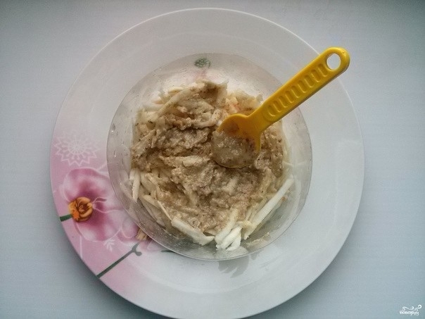 Натрите яблоко на крупной терке. При желании полейте яблоко лимонным соком, чтобы оно не потемнело. Я этого не делаю.