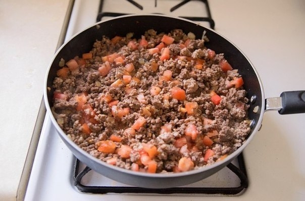 Следом положите помидоры, посолите и поперчите по вкусу. Через 10 минут добавьте чеснок и снимите фарш с плиты