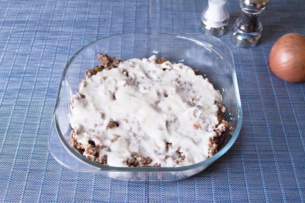 Залейте половиной соуса Бешамель. Повторите слои в том же порядке еще раз