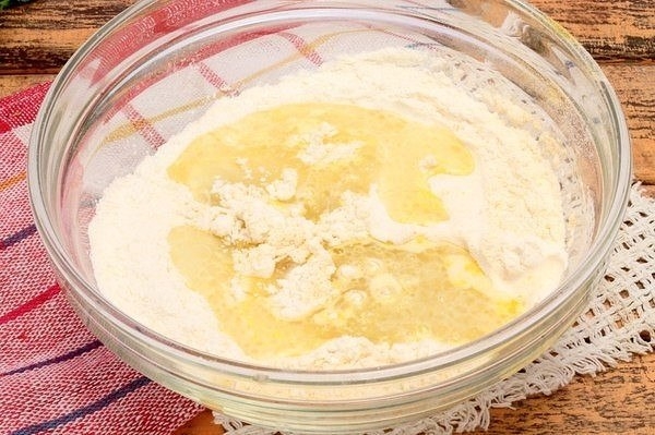 4. Вливаем к муке водно-масляный раствор, замешиваем тесто, при необходимости подсыпаем муку. Тесто для постного пирога с капустой должно быть пластичным, достаточно плотным, но не жестким.