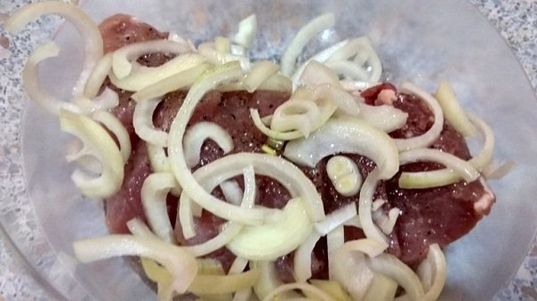 Мясо натереть солью, перцем, посыпать луком, залить растительным маслом и оставить мариноваться на 2-3 часа.