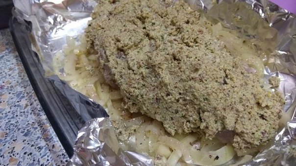 Лук убрать со свинины и выложить на фольгу. Сверху положить мясо и равномерно распределить панировку со всех сторон. Выпекать в разогретой духовке при 180 градусах около 1,5 часов. За 15 минут до окончания развернуть фольгу и подрумянить мясо.