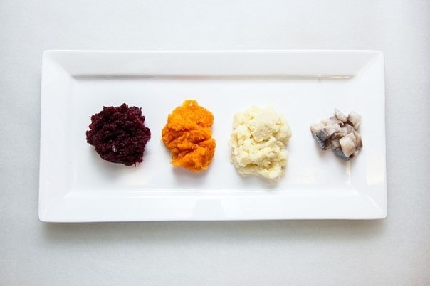 Отварную свеклу, морковь и картофель натереть на мелкой терке. Сельдь порезать кубиками.