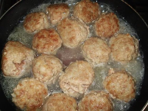 5. Сформировать тефтели диаметром примерно 4,5 — 5 см. Обвалять в муке. Выложить на разогретую сковороду с растительным маслом. Обжарить со всех сторон (занимает примерно 5 минут); крышку не закрывать. Затем налить в сковороду 1 стакан кипятка так, чтобы вода была до половины уровня тефтелей. Тушить 10-15 минут.