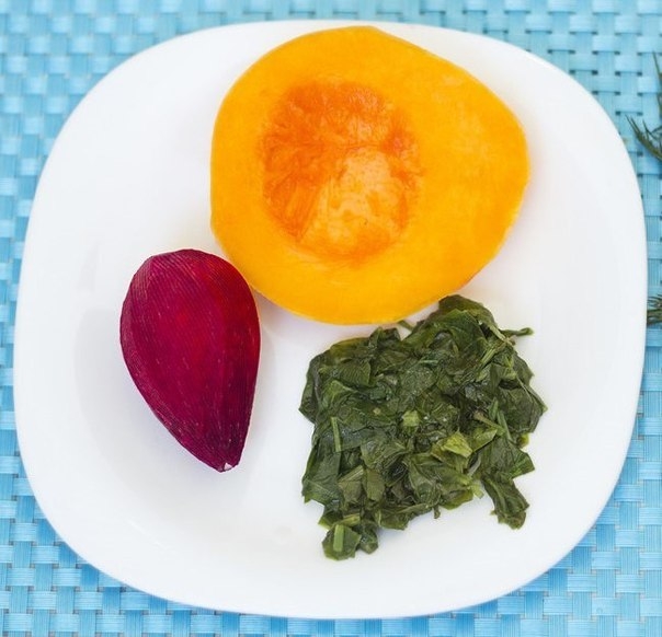 Шпинат проварить в кипятке 3 минуты, затем обдать холодной водой – для сохранения цвета; тыкву и свеклу почистить.