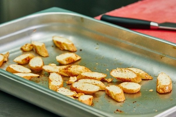 Багет порезать тонкими ломтиками, приправить паприкой и солью, добавить раздавленные зубчики чеснока, сбрызнуть маслом и хорошо перемешать. Отправить в разогретую до 140 градусов духовку на 12—14 минут.