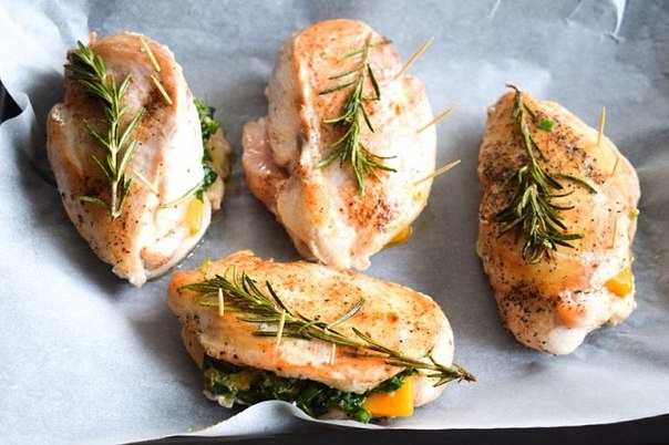 Обжарить на растительном масле на хорошо разогретой сковороде фаршированную грудку с двух сторон в течение 2 минут на каждой стороне. Во время жарки положить в сковороду веточки розмарина.
