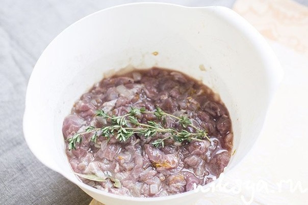 2. С утра откиньте мясо на дуршлаг и дайте маринаду полностью стечь, уберите лавровый лист и тимьян. Смешайте все с орехами и яйцом.