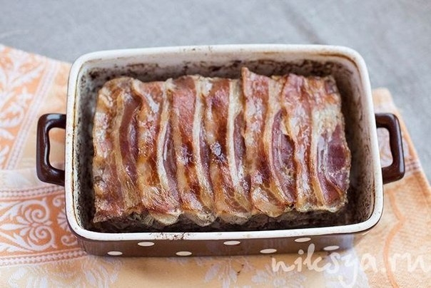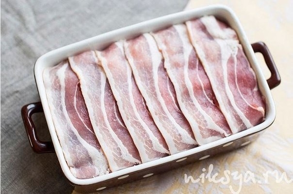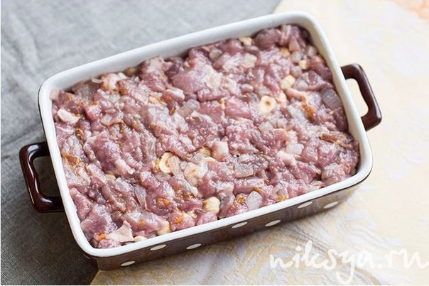 3. Разогрейте духовку до 160С. Установите на самый нижний уровень противень с горячей водой. 4. Выложите мясной фарш в форму для запекания размером 18х12 см. Хорошо утрамбуйте.
