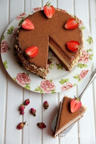 4. Готовый сметанник вытащить из формы. Можно покрыть верх и бока глазурью. У меня оставалось немного растопленного шоколада, я смешала его со сливками и кусочком масла. Слой получился очень тоненьким. Бока украсила крошкой из печенья, а верх посыпала какао-порошком. Украсила клубникой.
