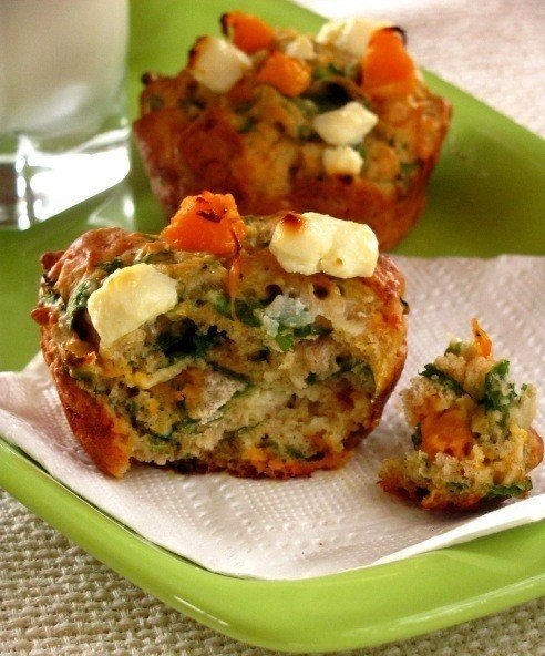 5. Выложите тесто в подготовленные формочки, наполняя каждую на 3/4 объема. Сверху выложите немного оставшихся кусочков тыквы и брынзы. Выпекайте 15-20 минут до готовности и золотистого цвета. Переверните на решетку и дайте немного остыть. Подавать можно теплыми.