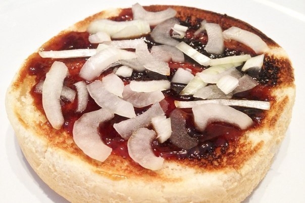 4. Нижнюю половинку булочки намажьте соусом на ваш выбор. Отлично подойдет соус Jack Daniel's, барбекю или обычный кетчуп. Сверху положите лук.