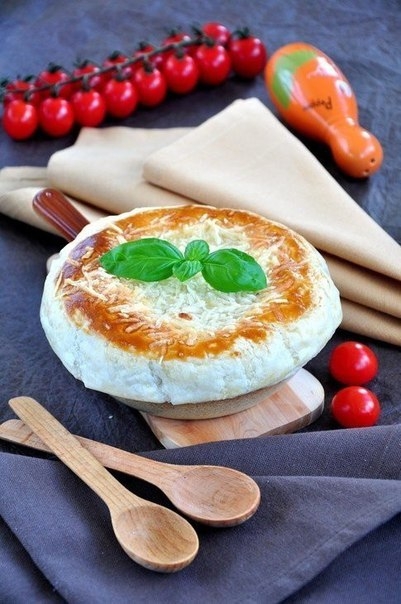 13. Из слоеного теста вырезать круг размером больше диаметра сковороды. Накрыть сковороду, хорошо прижать тесто. Натереть пармезан.