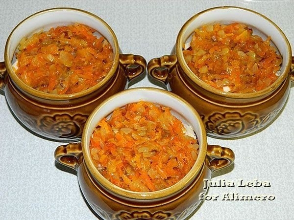 На разогретой сковороде спассеровала на подсолнечном масле в течение трёх минут измельчённый лук (на сильном огне).Добавила к нему крупно натёртую морковь, душистый перец горошком, соль, смесь молотых перцев. Перемешала, убавила огонь до минимума и тушила под крышкой 10 минут.Картофель очистила, нарезала кубиками и разложила по горшочкам.На него отправила аппетитные кусочки куриной грудки. Жидкую составляющую со сковороды пока что там и оставила.Грудку в свою очередь покрыла морковно-луковым слоем.