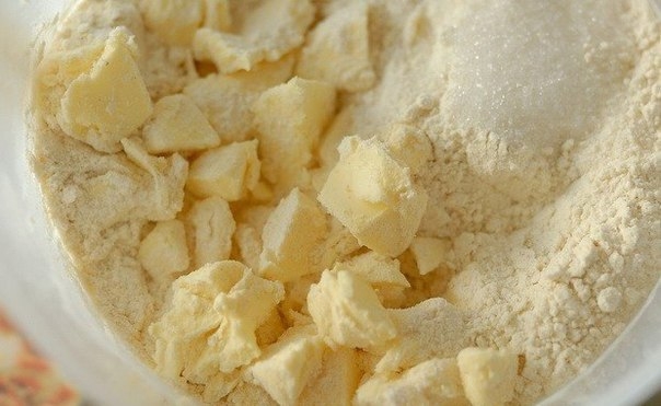 4. Возьмите тяжёлую вилку и, продавливая масло, интенсивно смешайте с мукой до образования крошки.