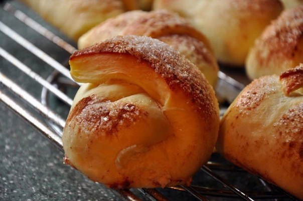 11. Взбила 1 яйцо с одной столовой ложкой воды и смазала рогалики. Сверху посыпала их сахаром и корицей.