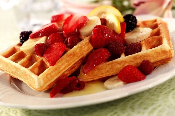 3. Вафли можно посыпать сахарной пудрой или незадолго до подачи на стол положить на них взбитые сливки.