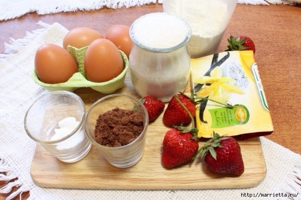 Мягкий, воздушный, с тонкой шоколадной прослойкой бисквитный пирог отлично сочетается со сладкими клубничными кусочками, не требуя дополнительных соусов,топингов и/или глазури.