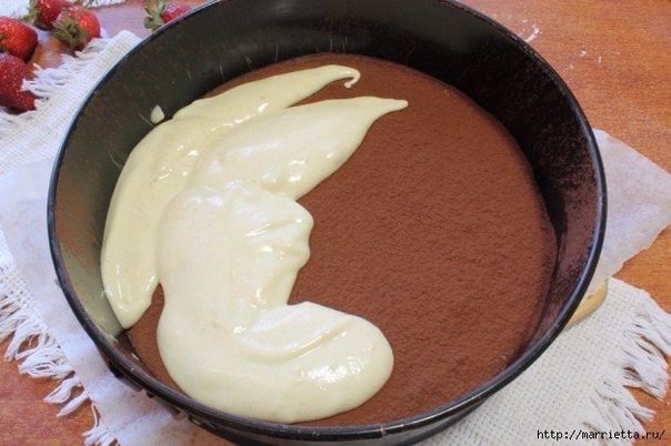 На бархатистый шоколадный слой ложкой выкладываем вторую часть теста; полностью закрываем темный слой. Заранее хорошенько прогрев духовку и снизив температуру до 170 градусов, печем заготовку 30-35 минут. Первые 15 минут дверцы печи не открываем, чтобы избежать оседания коржа.