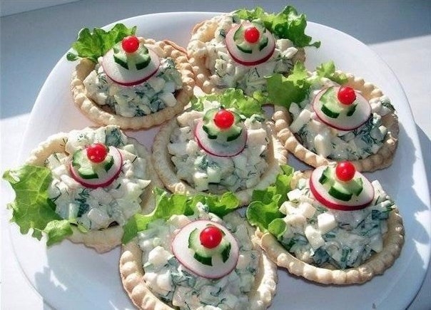 Выпекать при температуре 180 градусов около 15 минут или до золотистого цвета. Готовые корзинки остудить и вынуть из формочек.Все ингредиенты для салата нарезать кубиками и заправить майонезом. Наполнить корзиночки получившимся салатом и подавать.