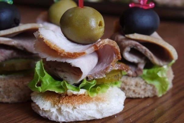 С помощью формочки или рюмки из хлеба, сыра и ветчины вырезать кружки. На шпажку нанизать маслину, сыр, ветчину, сыр и хлеб. По желанию украсить зеленью.