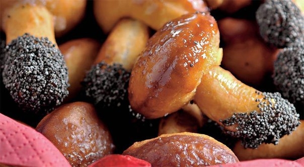 В часть готового сахарного сиропа добавьте немного красного пищевого красителя, обмакните в получившуюся глазурь грибы шляпками, затем наклейте несколько маленьких белых сахарных шариков-драже – получатся мухоморы вместо боровиков.