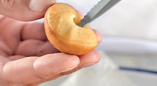 Разогрейте масло для фритюра до 180 °С и порциями обжарьте в нем шляпки и ножки. В более плоской части шляпок вырежьте небольшое углубление кончиком ножа.