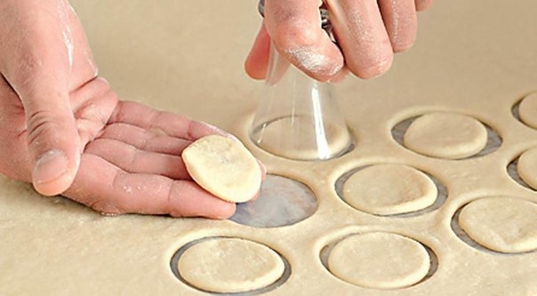 Раскатайте тесто в пласт толщиной 1/2 см, вырежьте маленькой рюмкой или выемкой кружочки – это шляпки грибов. Из обрезков теста скатайте цилиндр толщиной в карандаш и нарежьте на кусочки длиной 3–4 см – это заготовка для ножек грибов.