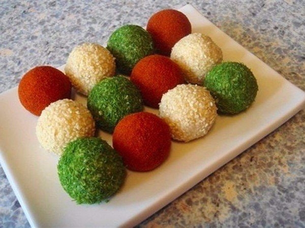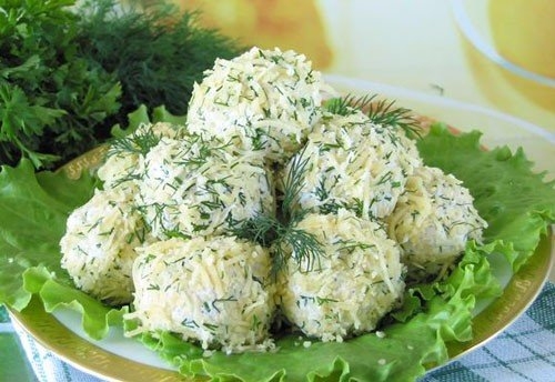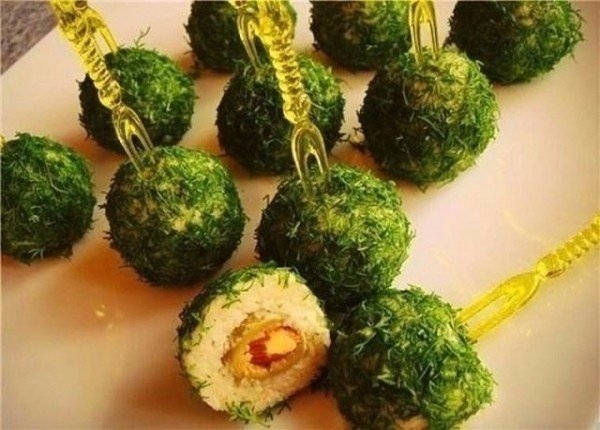 Обмакивая ладони в воду и отделяя небольшие части от плавленной массы, скатайте их в форме небольших шариков. Опустите шарики в подготовленные приправы и как следует обваляйте их в них.Заранее подготовьте блюдо с выложенными на него листьями зеленого салата и веточками укропа. Выкладывайте чесночные шарики на блюдо в любом порядке, какой вам придется по вкусу. Кстати, некоторые кулинары даже помещают в середину таких шариков грецкие орехи или арахис, взяв за пример конфеты "Рафаэлло" с миндальным орехом внутри. Вот ваша праздничная закуска и готова.