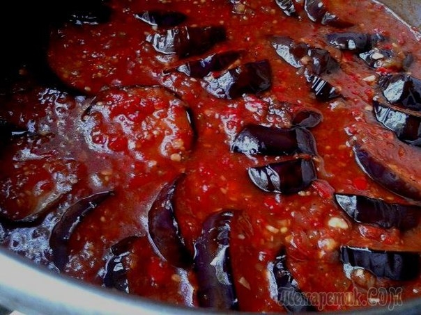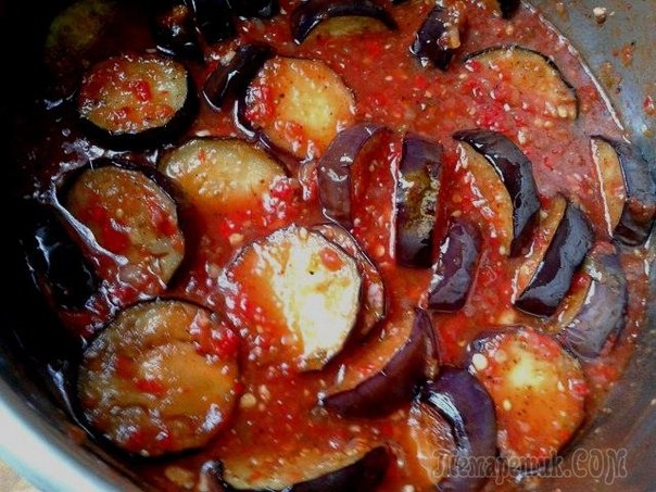Выложить в готовый маринад обжаренные баклажаны, аккуратно перемешать, чтобы хорошо покрылись. И от момента закипания, проварить не больше 5 минут!!!!! чтобы не превратить баклажаны в кашу.