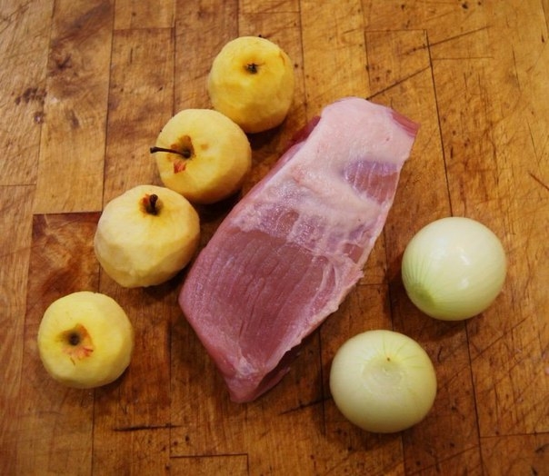 Мелко рубим все ножом, обжариваем мясо, добавляем лук и в конце яблоки.