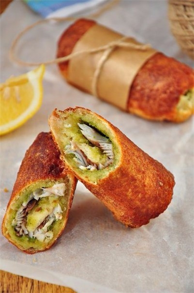 Замечательная закуска как для домашнего перекуса, так и для пикника. Хрустящая корочка, мякиш пропитанный соусом песто и начинка из рыбы..как же это вкусно и очень просто в приготовлении!