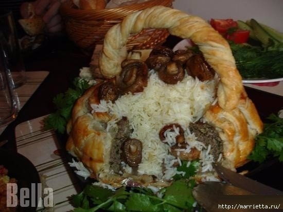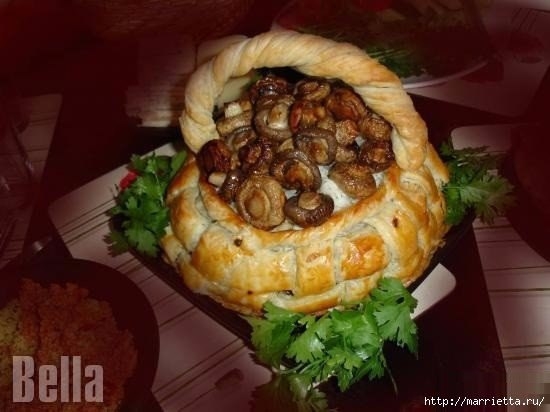 Слоеное тесто разрезать на длинные полосочки и из него крестиками собрать лукошко .