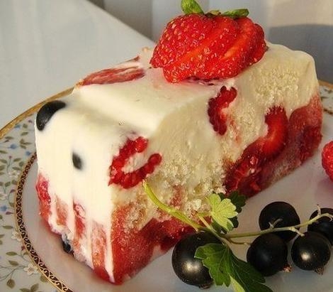 Залили нижний слой с ягодами-застыл за 2,5 часа,потом верхний(сметанный)с ягодами,еще 2 часа.