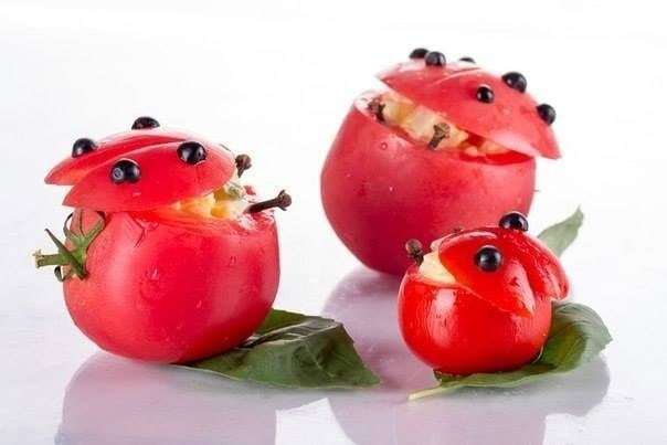 Для приготовления «божьих коровок» с одного бока помидора срезать небольшой сегмент. Надсечь его пополам, не дорезая с одной стороны до конца, — получатся крылышки. Из помидора извлечь мякоть — она не понадобится; из нее можно приготовить томатный соус. Наполнить помидор любой начинкой, накрыть крылышками. Из кусочков оливок, черной смородины или черники сделать крапинки, из сухой гвоздики — «глазки на ножках». В качестве начинки можно использовать тертый плавленый сырок, смешанный с таким же количеством натертого вареного яйца, майонезом, чесноком, солью и перцем.